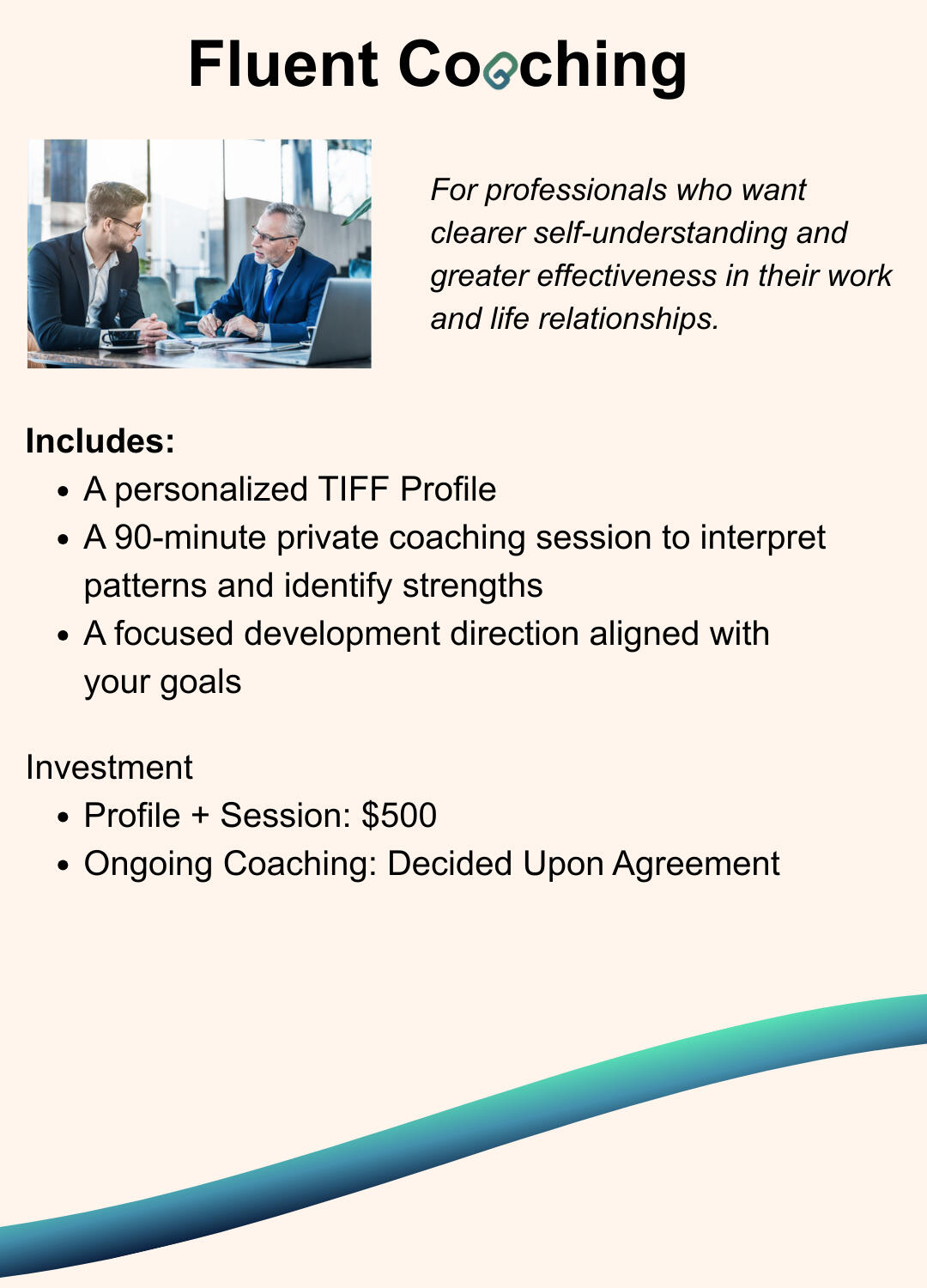 For individuals and teams who want to function more effectively in their relationships, roles, and responsibilities.Fluent Coaching™️ centers on how people use their energy in relationships when demand increases and choice narrows. In those moments, familiar patterns appear. Some patterns support connection, growth, and responsibility, while others limit effectiveness and strain relationships.Fluent Coaching brings awareness to these moments and ensures a